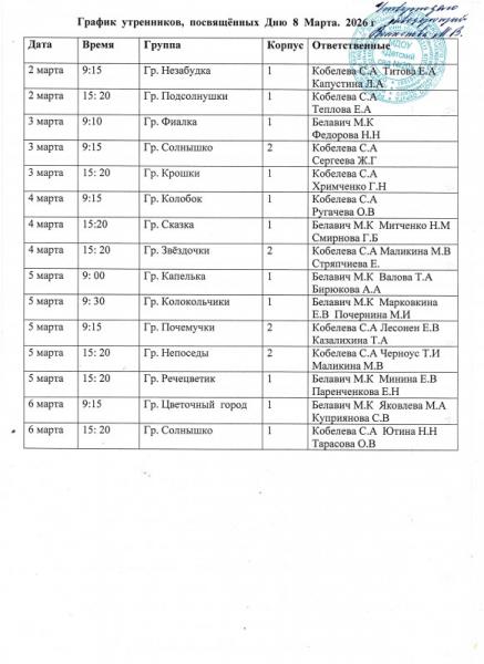 Уважаемые родители (законные представители) информация с графиком утренников, посвященных 8 марта