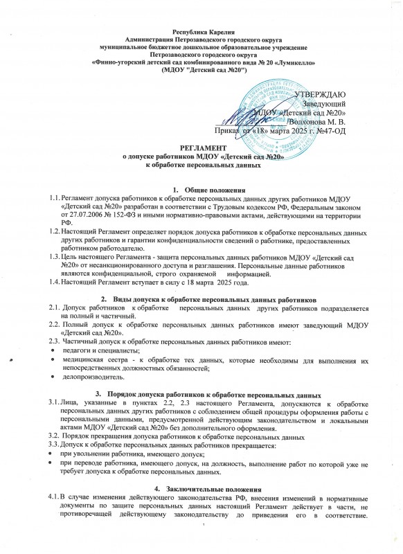Регламент о допуске работников МДОУ Детский сад 20 к обработке персональных данных